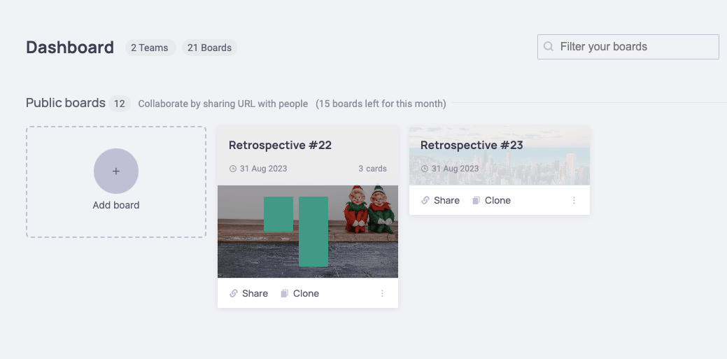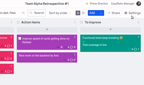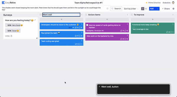When you clone the content of a board, you will now have the added benefit of cloning its surveys as well. This improvement makes it much easier to kick-start your next retro without having to recreate the surveys from scratch.