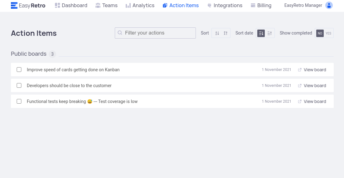With this enhanced feature, it's easier to find boards created by a particular team member, even if their name is common or misspelled. Simply type in their name or email into the search bar located at the top of the Boards page, and EasyRetro will instantly display all the boards that the user has created.