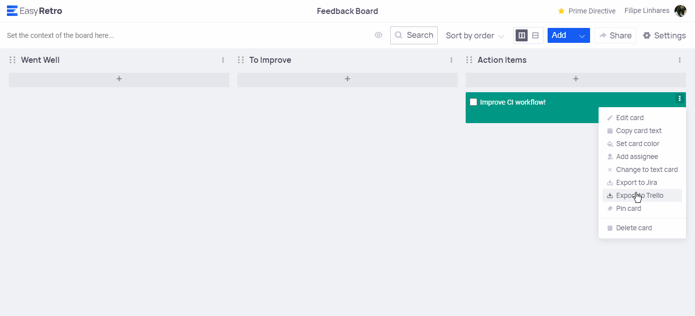 Trello just arrived to EasyRetro. Export your Action Items to cards with this new integration.